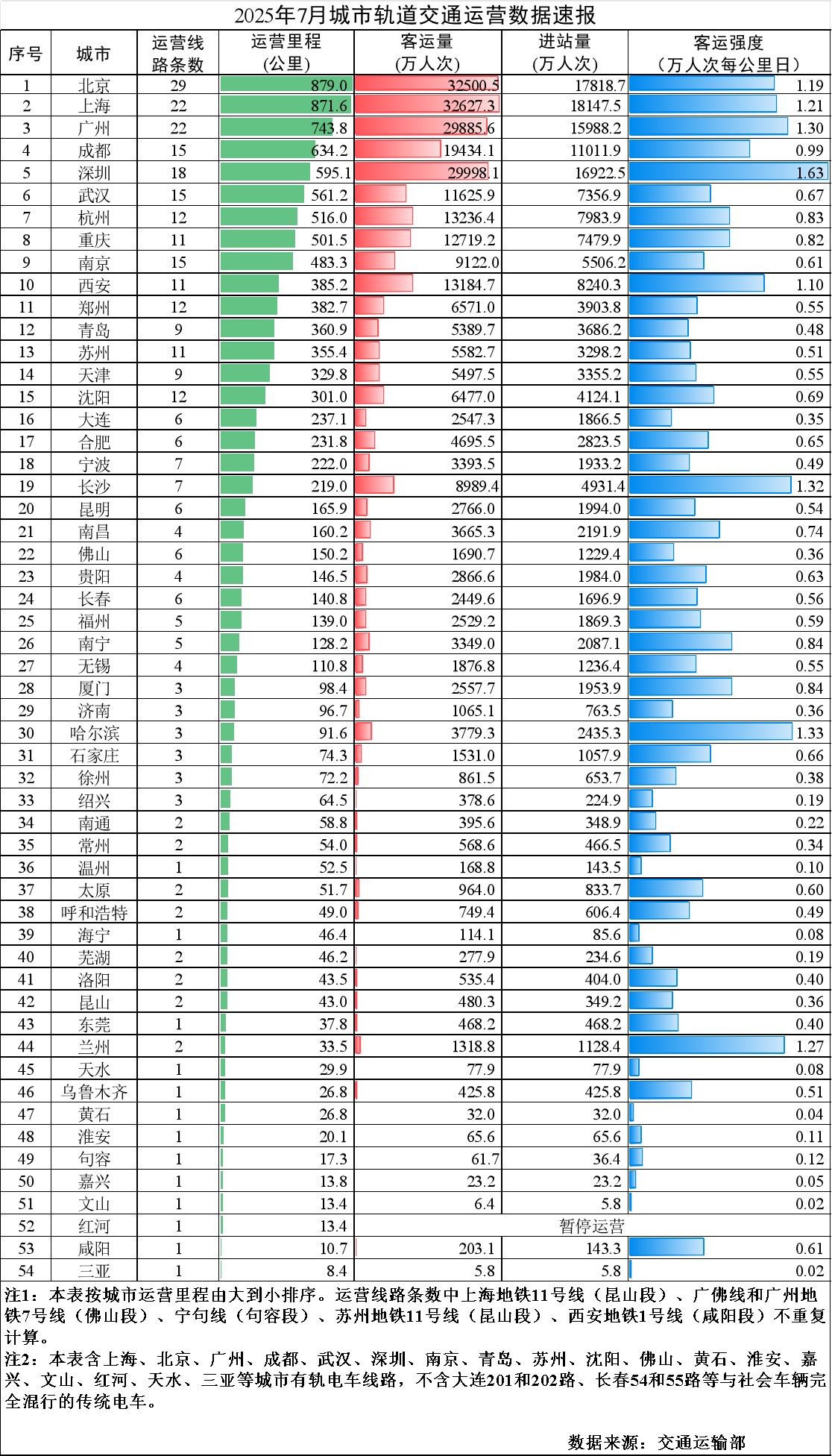 交通运输部消息,2025年7月,31个省(自治区、直辖市)和新疆生产建设兵团共有54个城市开通运营城市轨道交通线路330条,运营里程11146.8公里,实际开行列车374万列次,完成客运量29.2亿人次,进站量17.4亿人次。7月份,客运量环比增加2.3亿人次,增长8.6%,同比增加0.5亿人次,增长1.7%。7月份全国总运营里程的平均客运强度为0.845万人次每公里日,环比增长3.4%,同比降低5.7%。